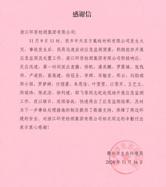 近日,浙江環(huán)資檢測集團(tuán)有限公司收到來自衢州市生態(tài)環(huán)境局的《感謝信》,感謝環(huán)資檢測集團(tuán)在11月9日本市中天東方氟硅材料有限公司發(fā)生火災(zāi)衢州市生態(tài)環(huán)境局啟動(dòng)的應(yīng)急預(yù)案中,積極響應(yīng),快速反應(yīng),抽派23名精干人員夜以繼日,連續(xù)奮戰(zhàn)3天3夜,快速提供應(yīng)急監(jiān)測結(jié)果,及時(shí)為事故處理措施提供數(shù)據(jù)支持,保障周邊環(huán)境安全。對環(huán)資檢測集團(tuán)相關(guān)人員辛勤的付出表示衷心感謝!